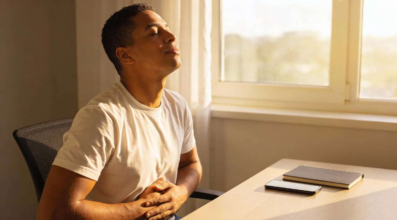 Inspire pelo nariz contando até quatro, segure o ar por sete segundos e expire lentamente pela boca contando até oito. Repita o ciclo por cerca de cinco minutos. A respiração diafragmática — quando o abdômen se expande mais do que o peito — ajuda a promover relaxamento e melhora a oxigenação do corpo.