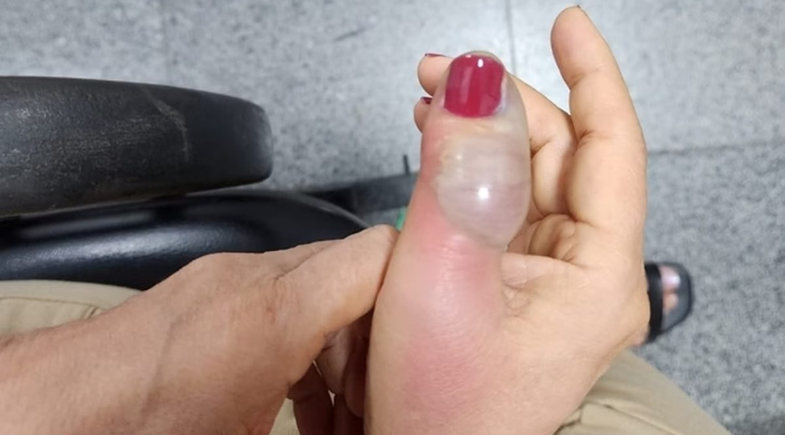 No mesmo dia, a dor começou a se intensificar. Mesmo com o uso de analgésicos, o incômodo aumentou a ponto de quase provocar um desmaio na noite após o procedimento. O dedo inchava rapidamente, e ela decidiu procurar ajuda médica já na manhã seguinte.