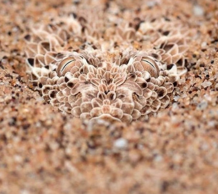 Consegue achar a cobra na imagem? Esta é uma víbora do deserto da Namíbia, que se esconde embaixo da areia. As suas escamas tem um tom de cor muito parecido com o terreno, fazendo com que elas fiquem camufladas no ambiente desértico em que elas vivem.