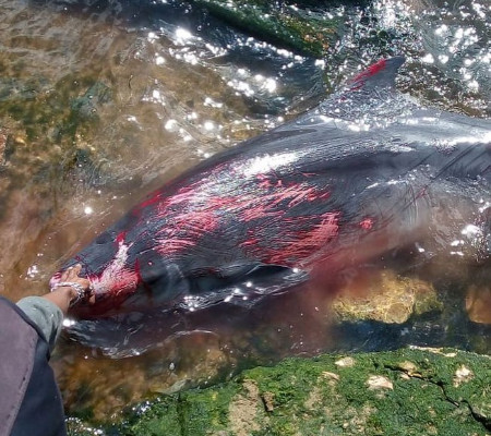 Antes de chegar nas pedras, o animal foi interceptado pelo que parecem ser tiros. Mesmo assim ele consegue sair da água. "Nem mesmo em terra estamos seguros", escreveu Jerry Smith na legenda de sua publicação no Instagram. Segundo outra postagem, a explicação é que uma foca teria atacado a baleia, da espécie cachalote-anão.