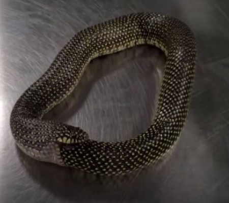 Uma publicação no YouTube de mais de um ano atrás ganhou repercussão agora. Um vídeo mostra uma cobra engolindo a próprio cauda. O portal MSN desvendou que as imagens foram compartilhadas por Rob Clark Venitox, que identifica o animal como uma cobra-rei salpicada, é possível ver como a espécie não-venenosa regurgita o rabo após ser induzida.