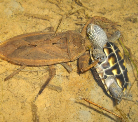 O autor do estudo e professor associado de entomologia da Universidade de Nagasaki, no Japão, Shin-ya-Ohba, divulgou uma foto de como um Kirkaldyia deyrolli, que é um predador de campos de arroz e áreas alagadas, consegue devorar uma tartaruga.