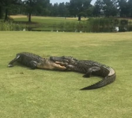 Os golfistas estavam inspecionando a área para dar sequência na partida, quando avistaram dois jacarés gigantes em plena batalha no meio do campo de golfe. Os répteis estavam distribuindo mordidas com suas grandes mandíbulas, segundo o portal MyrtleBeachOnline.