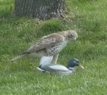 Apesar de todo seu esforço, a águia não conseguia induzir qualquer movimento de sua caça. O que ela não sabia é que, na realidade, o seu alvo era apenas um pato de decoração feito de plástico, que resistiu bravamente a todos os golpes aplicados ao seu corpo de mentira.