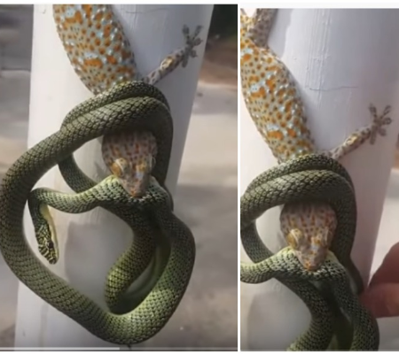 Bem, um homem corajoso fez exatamente o oposto. Após deparar como uma briga feroz entre uma cobra e lagartixa em um poste ele tomou uma atitude ousada e decidiu interromper a luta entre os dois animais.