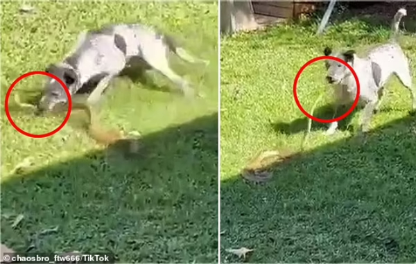 O destemido cão agarrou a cobra debaixo de um galpão de jardim de madeira e, em seguida, recuou cuidadosamente para um terreno aberto para ganhar vantagem sobre seu adversário altamente venenoso. Ele então dá uma boa sacudida na cobra marrom oriental, a espécie é responsável pelo maior número de mortes por picadas de cobra na Austrália, antes de mordê-lo e jogá-lo no chão.