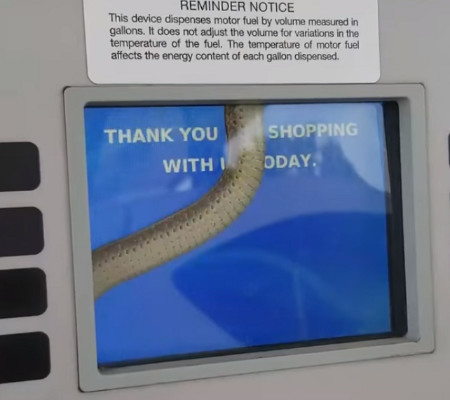 Uma cobra assustou a dona de casa Holly Malkames quando parou para abaster seu veículo em um posto de gasolina, no Kansas, estado dos EUA. Em muitos postos do país não há frentistas sendo que o próprio cliente abastece seu carro e paga diretamente na tela digital da bomba. (Vídeo a seguir).