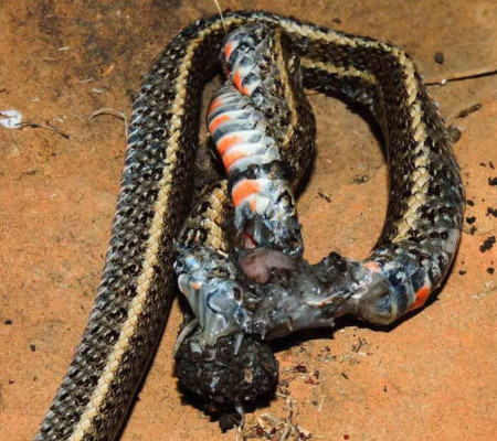 A serpente conhecida como jararaquinha-do-campo ou jararaca-de-barriga-vermelha (Erythrolamprus almadensis) de 40 centímetros que provavelmente foi morta por espancamento, é uma presa surpreendentemente grande para a tarântula.