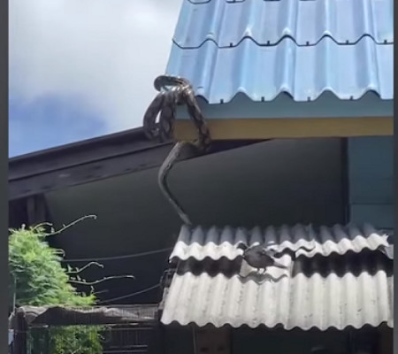 Um cinegrafista amador filmou toda a peripécia da serpente, que é vista deslizando pelo telhado de zinco da casa de palafitas enquanto observa peixes sendo alimentados por um residente na província de Samut Prakan. É póssível ouvir os gritos de medos dos curiosos.
