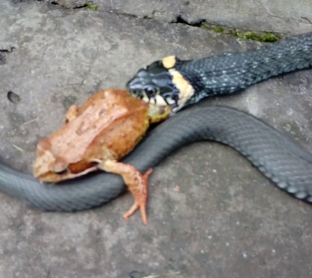Uma cobra víbora foi encontrada atacando e engolindo sapo ainda vivo. Ela ataca sua presa mordendo pelas patas traseira. O sapo tenta escapar em vão. Com seu veneno poderoso deixa o anfíbio fraco e tonto.