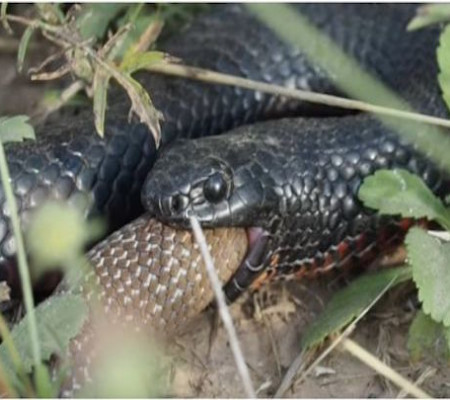 Após cerca de 20 minutos de luta, a cobra preta de barriga vermelha conseguiu engolir a cobra marrom