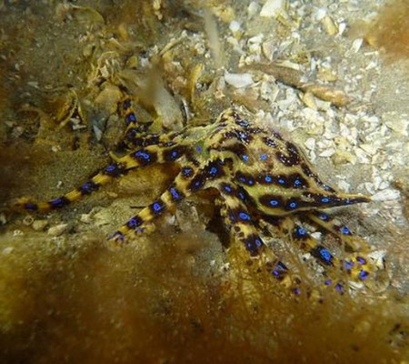 Um ótimo exemplo da complexidade da vida marinha é uma das criaturas mais belas e mais venenosas de todo o mundo. Trata-se do chamado polvo-de-anéis-azuis (de nome científico Hapalochlaena maculosa). A criatura costuma ser encontrada entre o Japão e a Oceania, ou seja, nos mares do Oceano Pacífico, e felizmente só ataca quem tem coragem suficiente de provocá-lo.