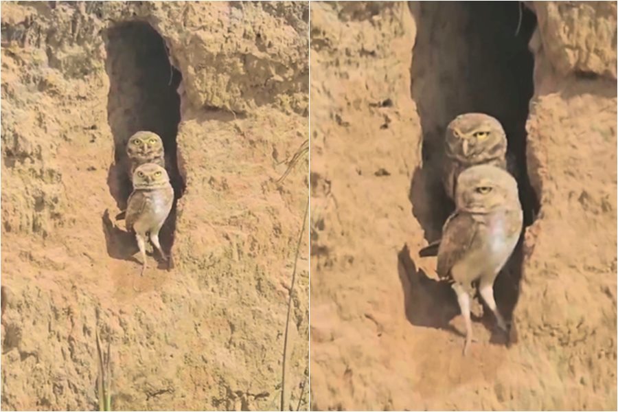 Um registro simples, mas encantador: duas corujas ficam paradas, lado a lado, encarando a câmera enquanto uma mulher grava o momento em Ponta Grossa (PR).