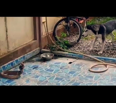 Dois cachorros "protetores" latem furiosamente para uma serpente que tinha rastejado do reservatório para o quintal e foi enfrentada pelos fieis "defensores" da casa.