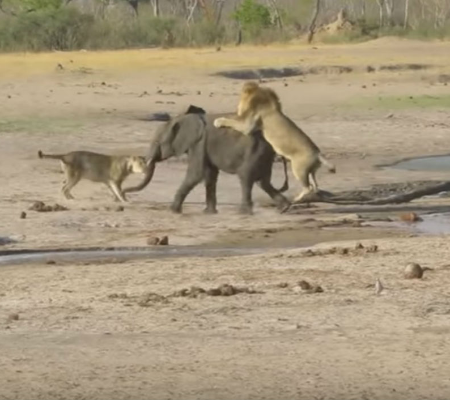 No vídeo, é possível ver um dos  leões se aproximando do filhote de  elefante , que parece ignorar a presença do felino por alguns instantes. Entretanto, ao perceber que corre perigo, o filhote tenta se afastar.