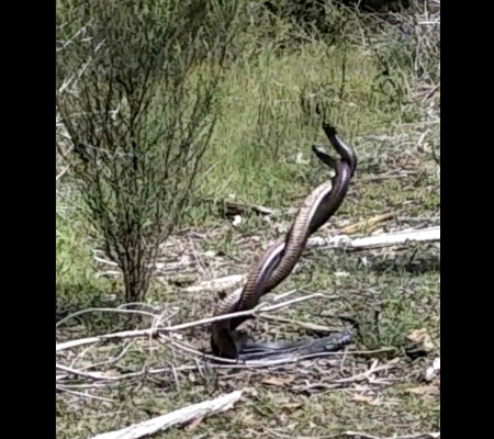 Duas cobras venenosas foram filmadas se enfrentando em uma batalha de forças no que pode ter sido uma briga por fêmeas. Em um vídeo, enviado ao Facebook, duas cobras negras do ventre-vermelho foram capturadas entrelaçadas entre si.