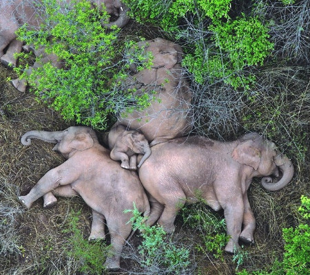 Uma registro impressionante: uma manada de elefantes-asiáticos que deixou sua floresta no Sul da China e marchava a 500 quilômetros rumo ao norte, foi fotografada tirando uma soneca.