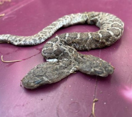 O apanhador Greyson Getty foi encarregado de limpar o local e, durante o processo, se deparou com a estranha criatura."Eu já tinha removido quatro cascavéis adultas e sete filhotes do buraco", lembra Getty, "então, puxei para fora uma com duas cabeças". "Um achado que acontece uma vez na vida", pontuou.