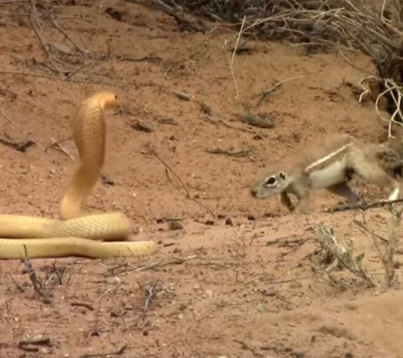 O esquilo é visto atacando a cobra várias vezes para que a cobra possa deslizar para longe