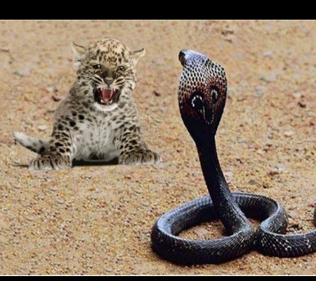 Os dois leopardos partem para cima da cobra naja várias vezes, enquanto a cobra tenta dá um bote.