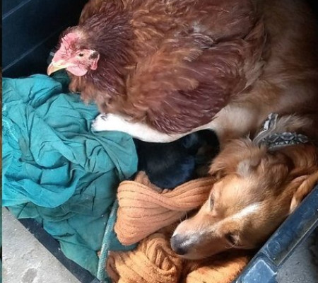 O que encantou os moradores da região, foi a forma como Mel e seus filhotes foram acolhidos pela galinha da família que a está acolhendo como lar temporário. A ave “amadrinhou” os filhotes e ajuda a mamãe canina a aquecê-los nos dias gelados de Santa Catarina.