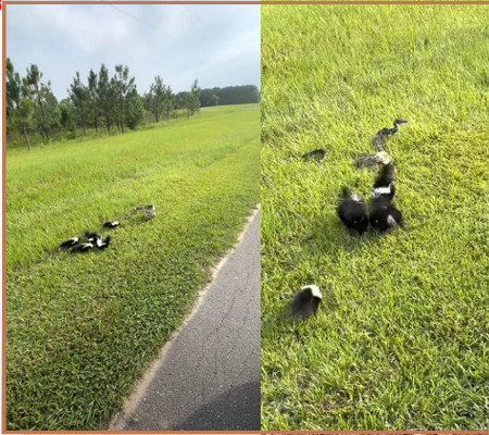 Um grupo de filhotes de Gambás (espécie Cangambá ) se juntaram em equipe para colocar para correr uma terrível cobra píton que estava camuflada em um gramado, no Estado do Alabama, EUA.