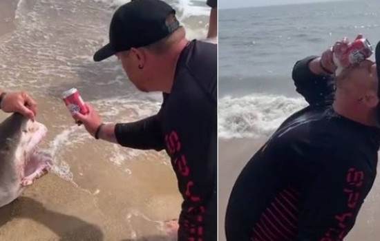 Um banhista provocou ira nas redes sociais da web ao abrir uma lata de cerveja usando os dentes de um tubarão encontrado morto em uma praia. O animal tinha anzol e linha presos à boca.