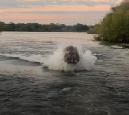O grupo estava em um passeio pelo rio Zambeze, Zâmia na África no domingo, observando o pôr do sol, mas de repente os hipopótamos gigantes surgem entre as águas e perseguem a toda velocidade a lancha.