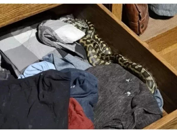 Um homem encontrou uma cobra píton de 2,5 metros escondida na gaveta do guarda-roupas de sua casa, em Brisbane, na Austrália. Por sorte, essa espécie não é peçonhenta, diminuindo o susto.