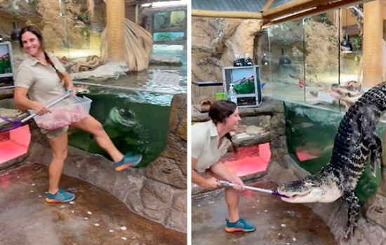 Darth Gator estava sendo alimentado pela tratadora Juliette em seu cercado no The Reptile Zoo.