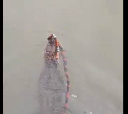 O jacaré, que a princípio parecia estar dormindo, começou a se mover levando a serpente em seus dentes sem essa apresentar qualquer resistência.