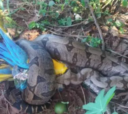 Uma jiboia de 1,7 metros, foi capturada comendo uma arara azul e amarela ou "canindé", espécie em extinção, nos fundos de uma empresa, localizada na zona rural de Ituiutaba (MG). O Corpo de Bombeiros foi chamado para resgatar os animais.