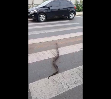 Uma jiboia foi flagrada atravessando a rua na faixa de pedestre, na Avenida Hermina Torquarto da Silva, em frente ao Parque das Águas, em Cuiabá, nessa quarta-feira (29). A jornalista Marisol França, que caminhava pelo local, gravou um vídeo da cena.