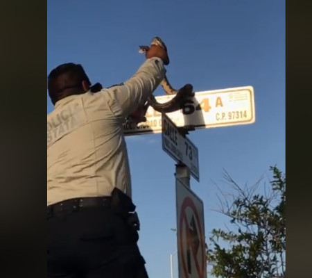 O policial conseguiu tirar o réptil do sinal de trânsito antes que ele caísse de lá ou fosse atropelado por algum motorista. Crianças que estavam passando pela esquina avistaram a jiboia-constritora pendurada no sinal de trânsito e entraram em contato com policiais, escreve The Yucatan Times.
