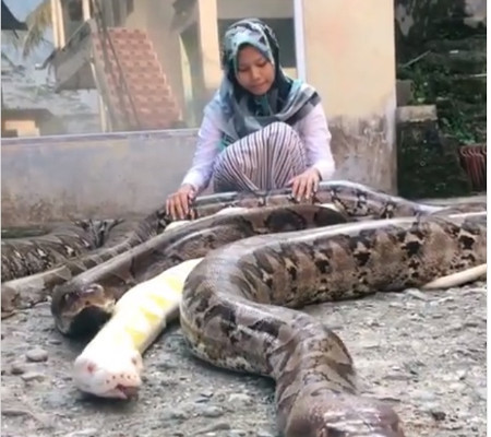 Impressionante e corajosamente uma jovem da Indonésia chamada Chalwa Ismah Kamal, está fazendo sucesso em redes sociais como o Instagram e TikTok devido ao seu hobby: fazer vídeos cuidando e acariciando enormes pítons.