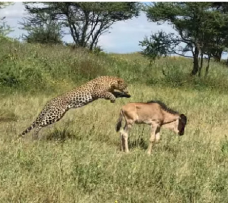 Nas imagens captadas, o leopardo se aproxima silenciosamente por trás do pequeno gnu, espera, necessitando de apenas um salto para derrubá-lo com sucesso. Os felinos slvagens sempre atacam com golpes nos pescoço, o que imobiliza suas presas.