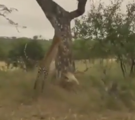 Leopardo conseguiu se salvar milagrosamente de um ataque de hiena, subindo em uma árvore.