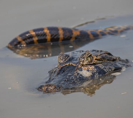 A anaconda pode ser vista envolvendo-se em torno de um dos membro do crocodilo tentando sufocar-lo. O fotógrafo da vida selvagem Kevin Dooley, 58 anos, teve "sorte o suficiente" para capturar esse momento extremamente intenso e diz que "nunca capturou algo assim antes".