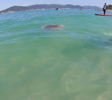 A medusa foi encontrada por Fábio Lopes, que fazia stand up paddle no local. Ele viu o animal por volta das 8h30 e fez o registro em vídeo.