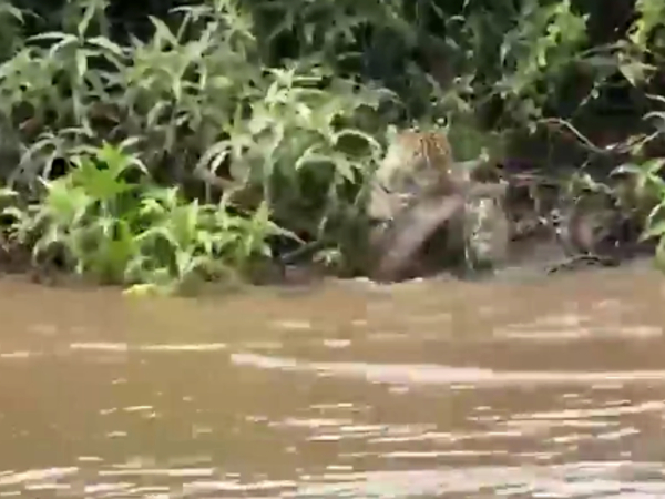 Um grupo de pescadores flagrou uma onça-pintada capturando um jacaré para o almoço. O flagrante foi no Rio Miranda, em Mato Grosso do Sul.