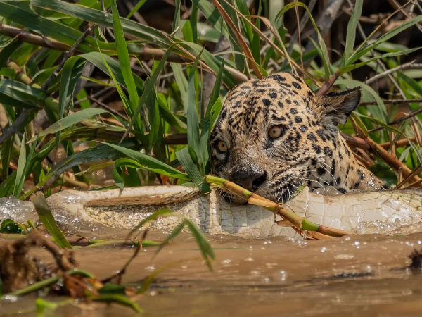Onça captura jacaré e impressiona com forte mordida em rio do Pantanal