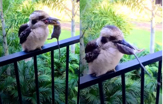 Um enorme pássaro chocou os moradores de um casa na Austrália. A espécie identificada por kookaburra, foi flagrada após devoar um rato morto inteiro. Um casal filmou o momento da comilança na varanda.