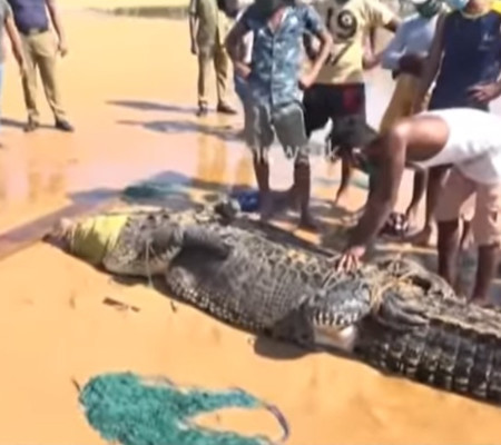 Um grupo de pescadores capturaram um crocodilo que media quatro metros no Sri Lanka . Após trazerem o animal para uma praia, uma multidão se aglomerou perto do réptil e ajudou a remover o animal do local.