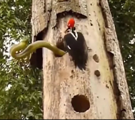 Pica-pau luta com cobra de 3 metros para salvar seus ovos; Vídeo