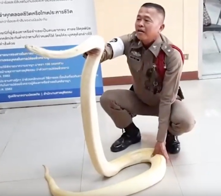 Píton albina invade residência e vai parar em delegacia na Tailândia