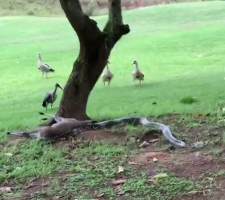 O réptil, uma píton-africana, estava no meio de um campo de golfe desfrutando seu café da manhã, quando foi interrompido por um ser humano tentando capturar o evento, já depois do início do vídeo.