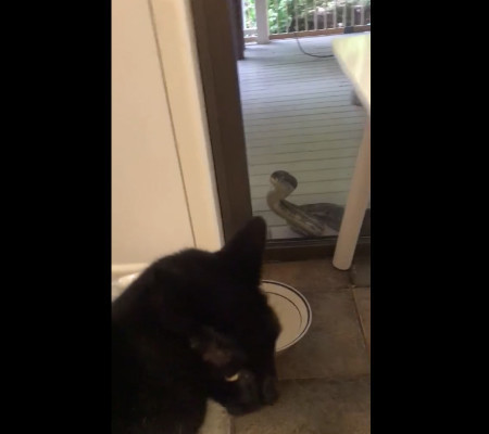 No vídeo vemos a cobra observando atentamente os movimento do gato esperando uma oportunidade para lançar um bote sobre o felino. Por sorte existia uma porta de vidro separando os dois animais.