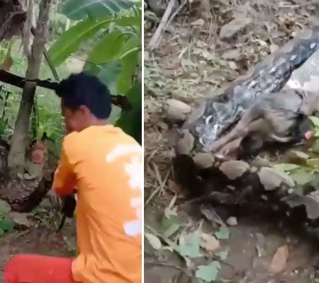 Entretanto, a pobre idosa não pôde fazer nada, e pediu ajuda às autoridades locais. Quando a ajuda chegou, já era tarde demais, a píton havia engolindo o cão e estava entrelaçada a uma árvore. Ao ser capturado, o réptil regurgitou o animal de estimaçãona frente da dona do cachorro.