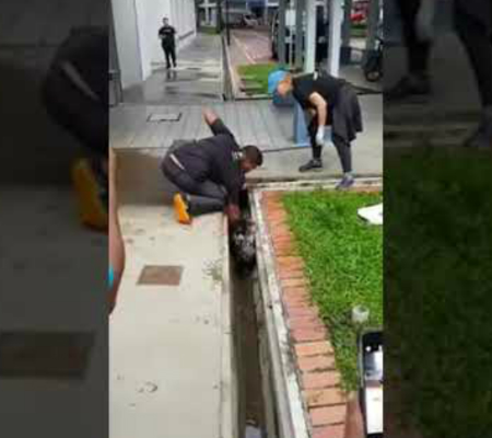O vídeo mostra o momento do resgate, em que uma equipe tenta remover a píton entalada em uma canaleta na cidade de Jurong West, em Singapura.
