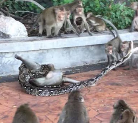 Um bando de macacos cercou a cobra para tentar salvar o amigo, mas a cobra complicou o salvamento e não deu chance alguma.